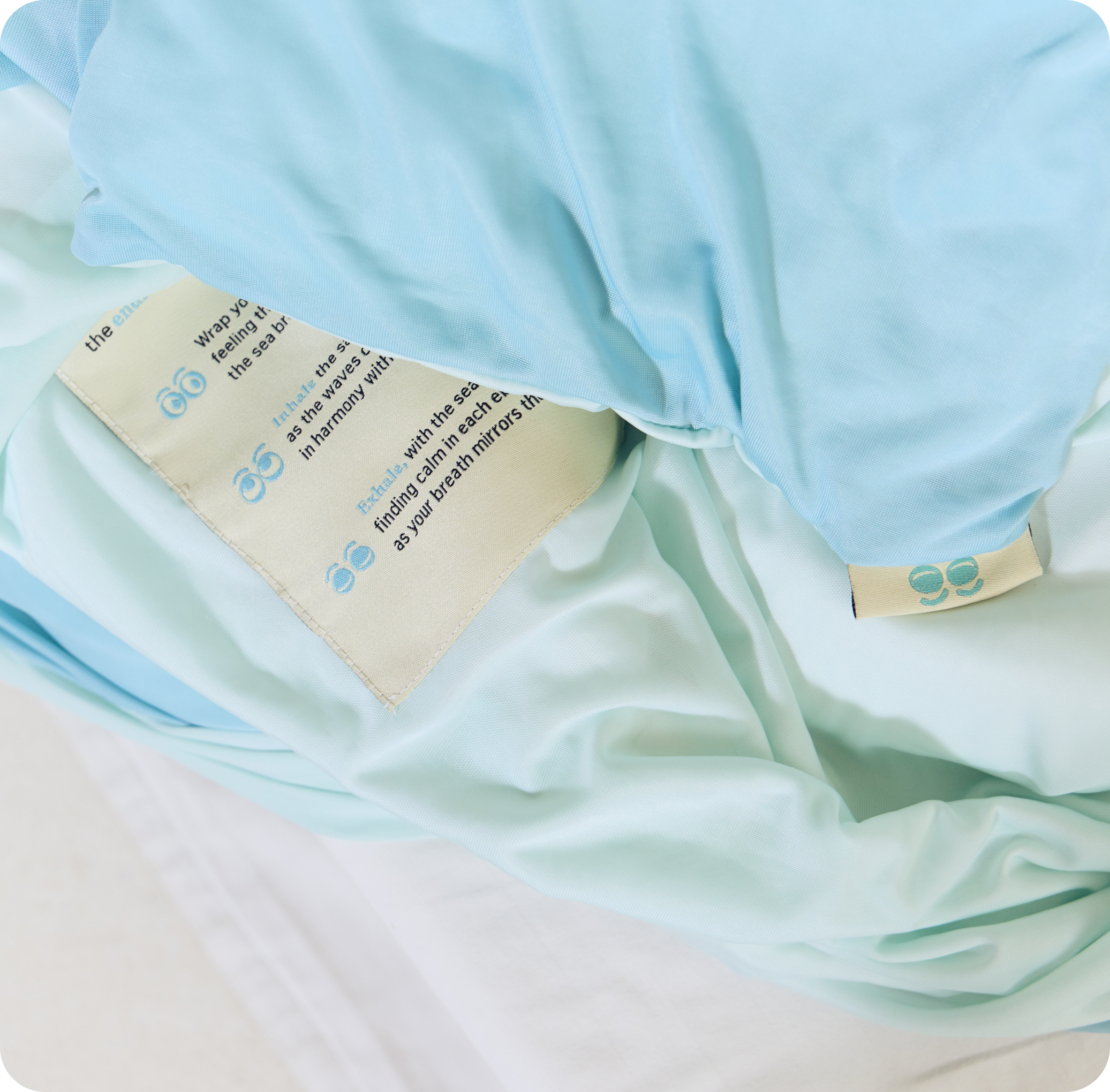 Attach your Azure Ocean cover to the weighted blanket by tying the cover’s inner ties to the 8 built-in loops on the blanket. Once tied, lay the blanket flat on your bed, couch, or favorite spot, aligning it so the weight is evenly distributed across your body. Before drifting off, try the wellness label’s guided breathing exercise, inspired by the calming waves of the ocean, to help you relax and unwind. To store, roll your Doozie neatly and place it inside the included duffel bag, keeping it ready for its next use.