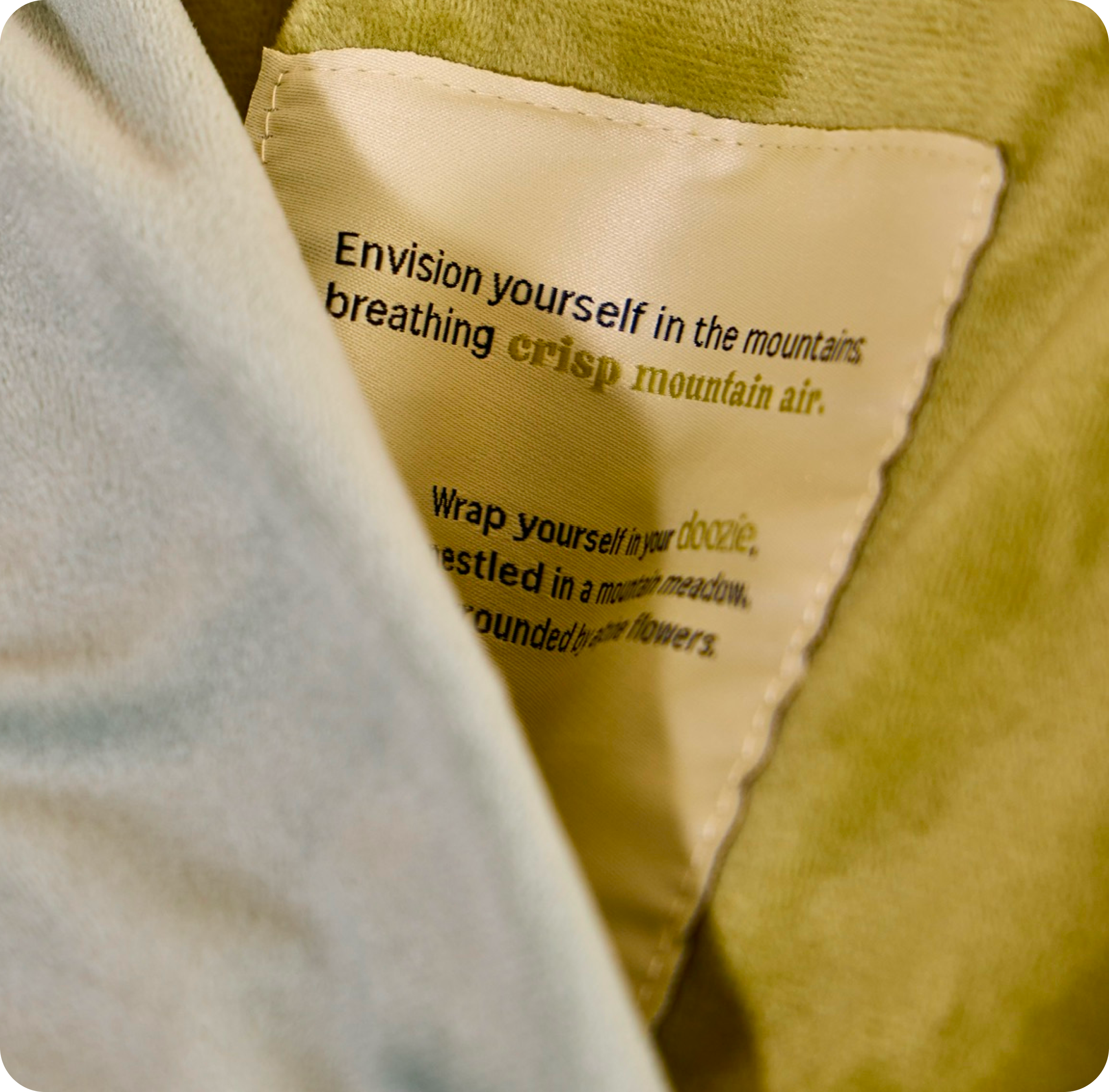 We offer two types of covers. Doozie Fluff is our mink cover – plush and cozy, perfect for cold sleepers who like that extra warmth. Doozie Flo is our cooling cover – silky and temperature-responsive, ideal for hot sleepers who like keeping things fresh. All covers are inspired by nature, with meditative breathing exercises printed on each one to help you relax deeper.